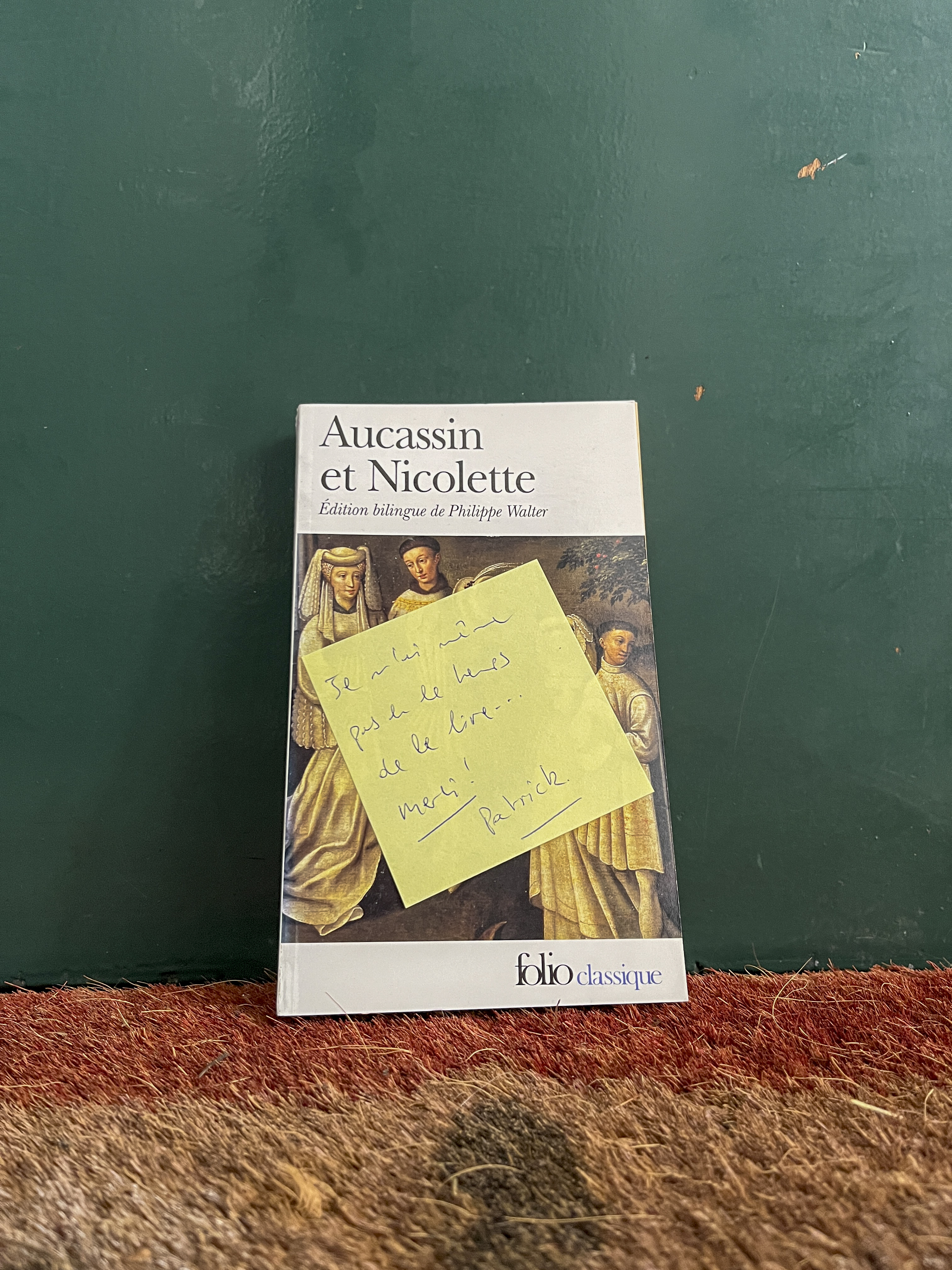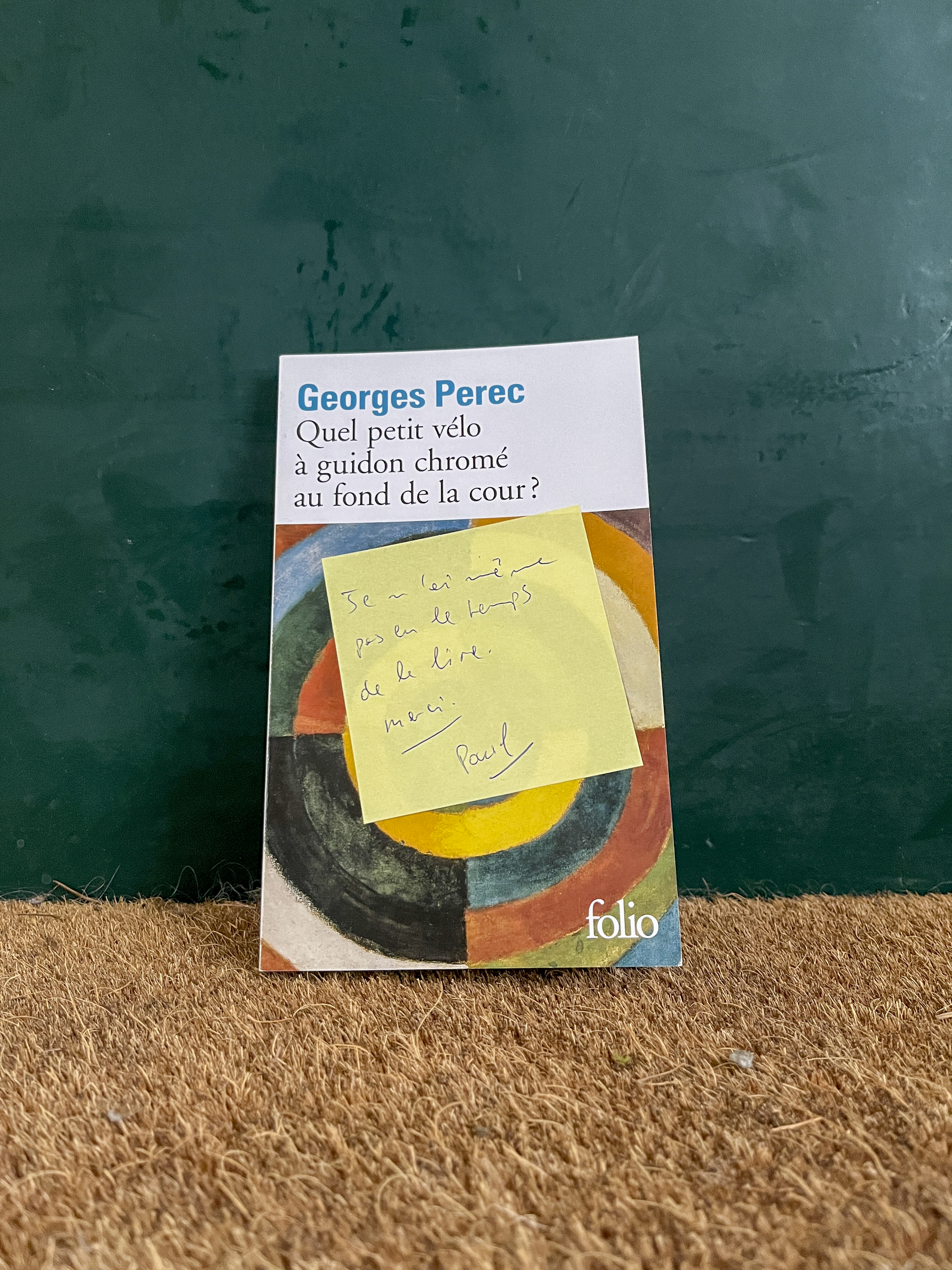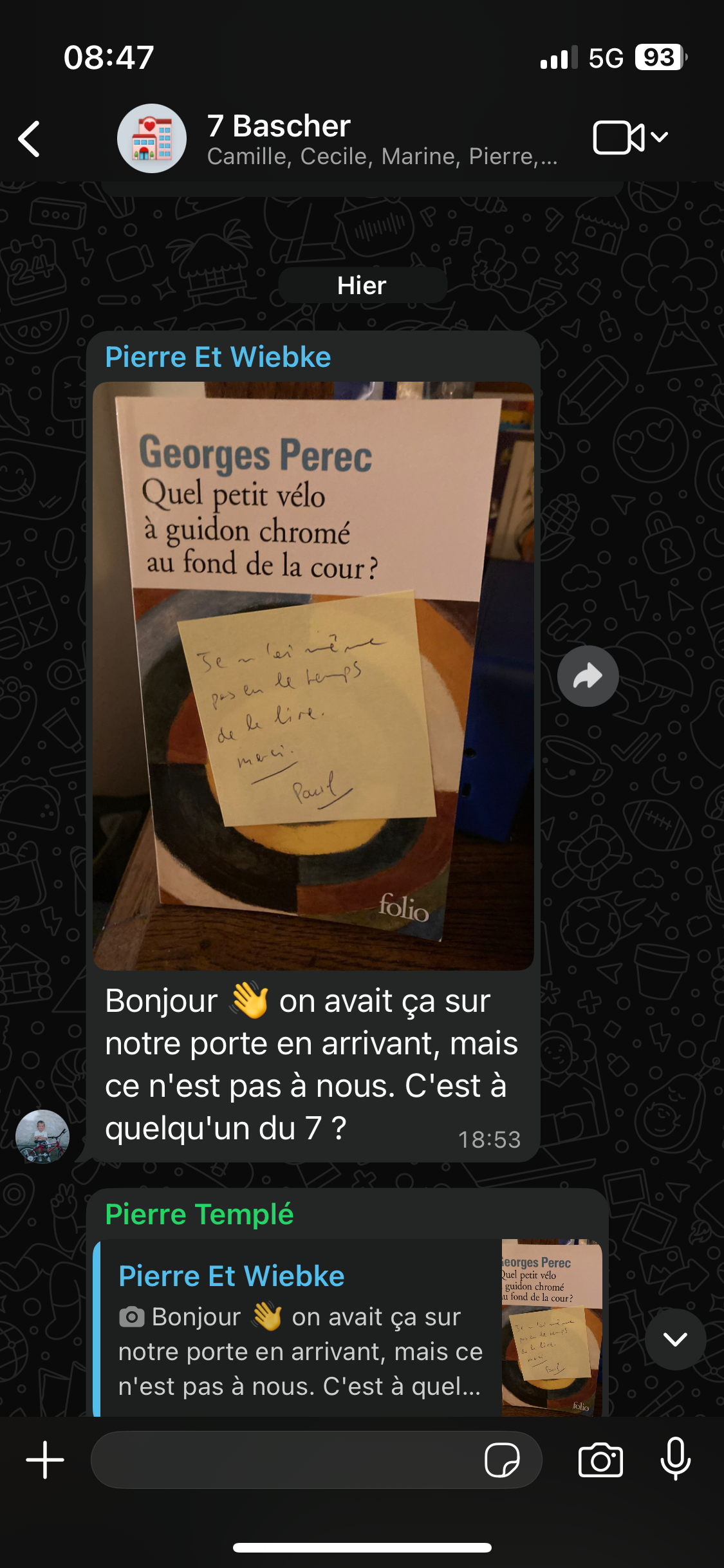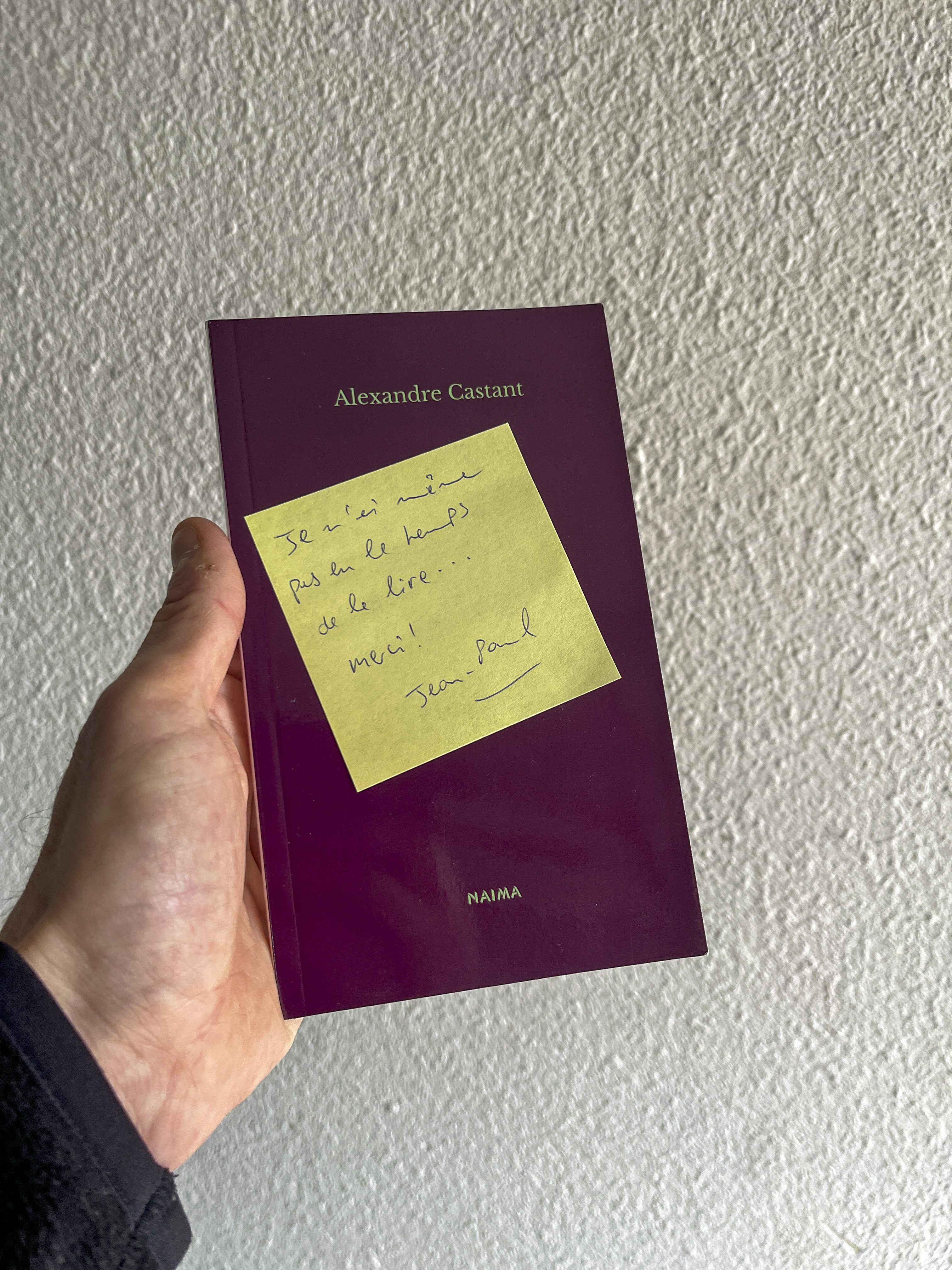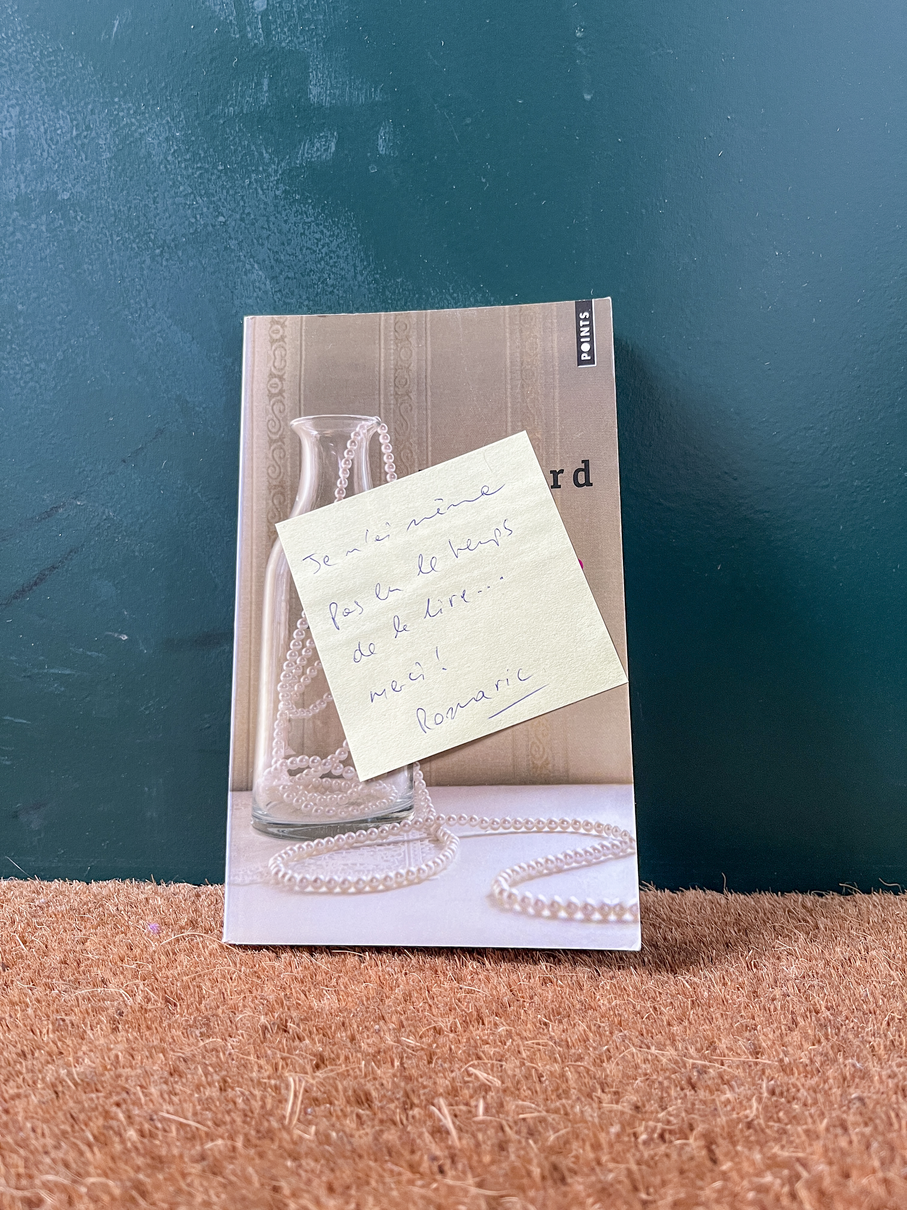 Le vendredi 12 décembre 2025 à 12h35, je pioche des livres dans ma bibliothèque avec un post-it sur lequel est écrit : “Je n’ai pas eu le temps de le lire... Merci !”. Je signe d’un nom différent sur chaque mot. Puis, dans mon immeuble, je descends en déposer un par étage devant une porte choisie au hasard. Je prétends en avoir moi-même retrouvé un devant ma porte (Chaos d'Alexandre Castant). Nous nous interrogeons sur ce mystère.
